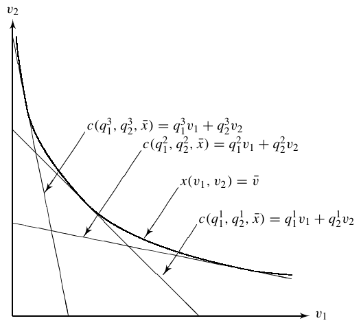 Kostenminimierung der Faktorkosten Angenommen, man kennt die Kostenfunktion $c(\vq,x)$, die auf der Basis einer Produktionsfunktion $x(\vv)$ hergeleitet worden. \[ c(\vq, x) = \min_{\vv\geqq\vO} \left\{ \vq\T\vv\ |\ x\leq x(\vv) \right\} \] Kennt man nur $c(\vq,x)$, dann stellt sich die Frage, was man implizit über die Produktionsfunktion $x$ weiß. Mit Hilfe der Dualitätstheorie lässt sich die Produktionsfunktion aus der Kostenunktion (bei gewissen Regularitätsbedingungen) zurückgewinnen. Das entsprechende duale Problem basiert auf unendlich vielen Restriktionen für die Preise $\vq$: \[ x(\vv) = \max \left\{ x\ |\ c(\vq, x)\leq \vq\T\vv\quad \forall\ \vq\geq\vO \right\} \] Um sich vorstellen zu können, wie das Problem "arbeitet", stelle man sich einen Ball vor. Dieser Ball wird nun durch sämtliche ihn tangierenden Ebenen (genauer alle Halbräume, die den Ball enthalten) beschrieben. Das Konstruktionsprinzip lässt sich graphisch veranschaulichen, wenn man sich bei der gewonnenen Produktionsfunktion $x$ auf ein Outputniveau $\bar x$ konzentriert. Aus den unendliche vielen Restriktionen sind hier nur die interessant, die die Isoquante $\bar x$ tangieren.